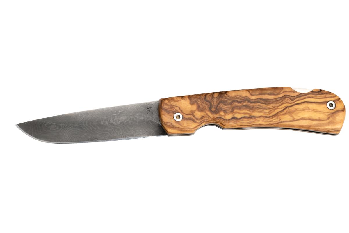 Zavírací nůž s čepelí z luxusní ručně kované damascénské uhlíkové oceli. Čepel s plochým šavlovým výbrusem přechází do sekundárního ostří, vrcholí sníženým hrotem - tj. typ drop point. Střenky vyrobeny ze dřeva olivovníku. Hřbetní pojistka pro čepel - backlock. Vyvážené propojení kvalitních a dovedně zpracovaných materiálů v krásné a zároveň velmi účelné formě.
